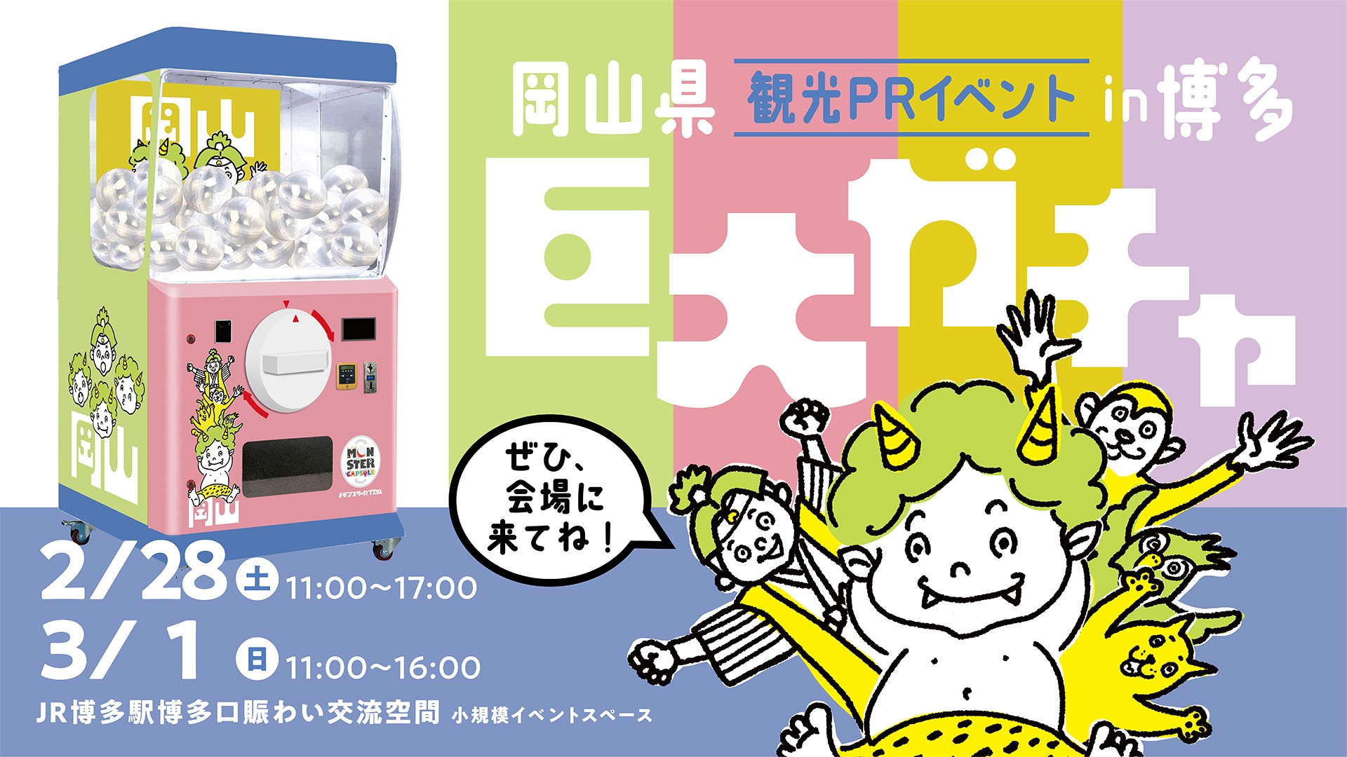 岡山県観光PRイベントがJR博多駅博多口賑わい交流空間で開催『巨大ガチャ』抽選に高さ2.0mの「モンスターカプセル」が登場!2026年2月28日(土)・3月1日(日)2日間開催